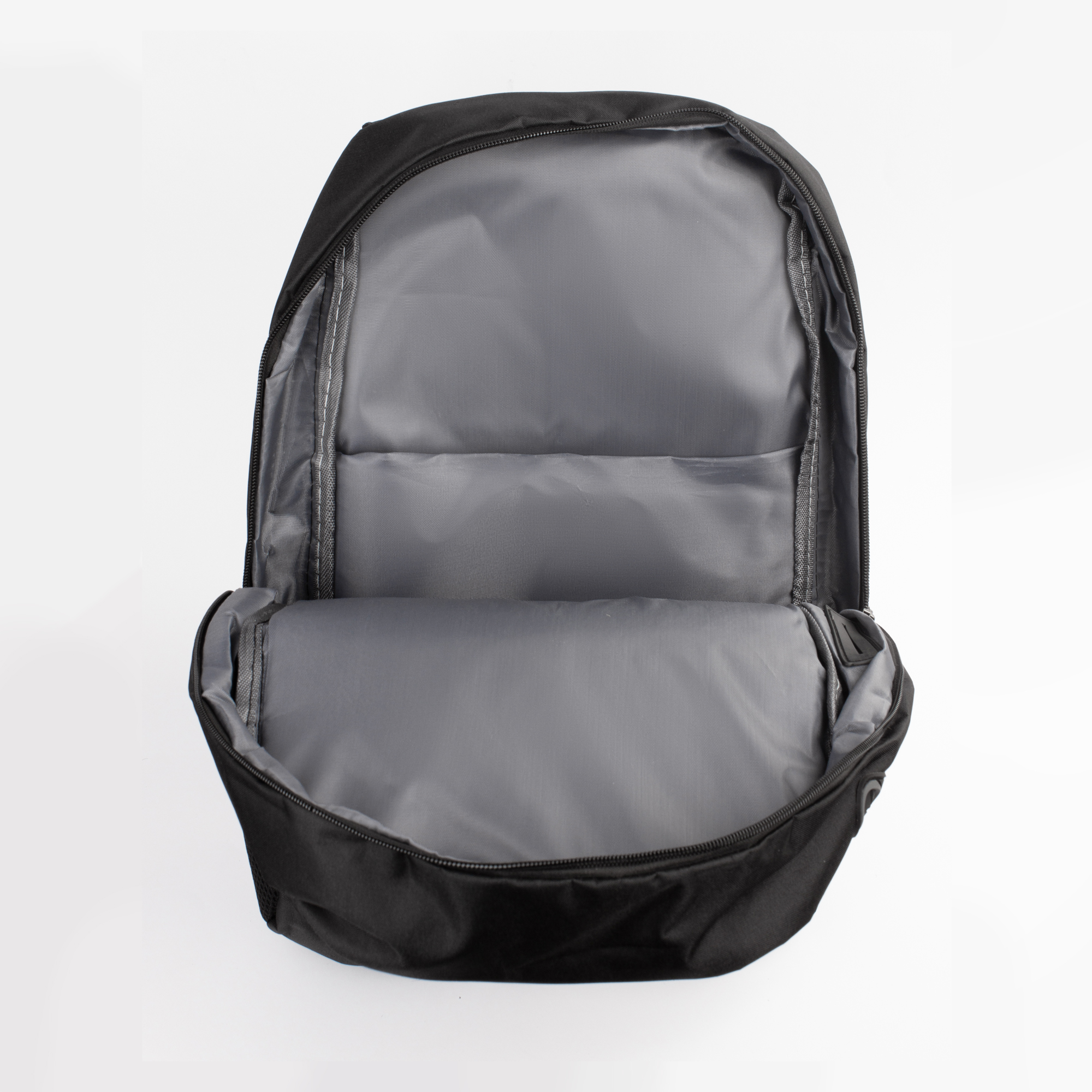 Рюкзак держит форму благодаря плотной вставке, внутри серый подклад. Сбоку имеется разъем для подключения зарядки и подготовка для проводных наушников, прорезь нужно сделать самостоятельно. На лицевой стороне расположен карман на молнии и дополнительный карман-сетка сбоку.