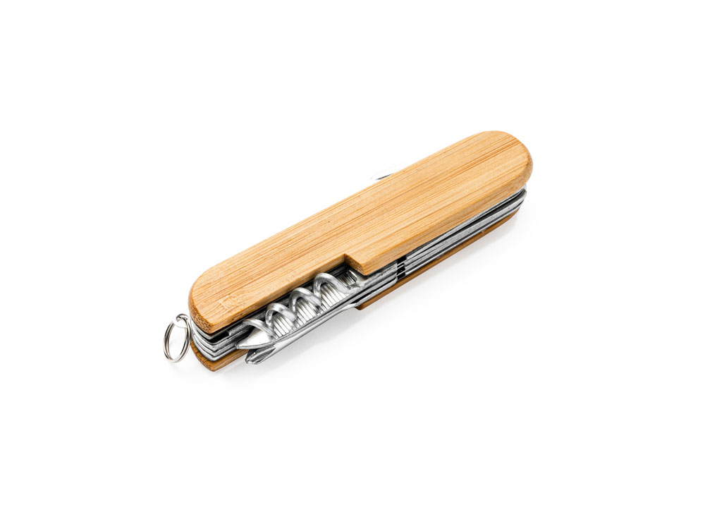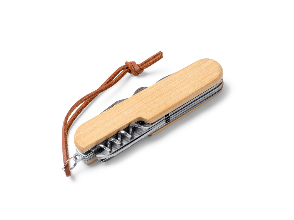 Мультифункциональный нож из нержавеющей стали и бамбуковым корпусом. 9 функций. В комплекте ремень для транспортировки из кожзаменителя.