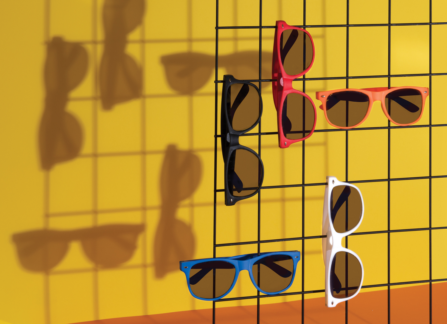 Солнцезащитные очки из полипропилена с черными акриловыми линзами с защитой UV 400. Петли с металлическими винтами для надежного крепления дужек.