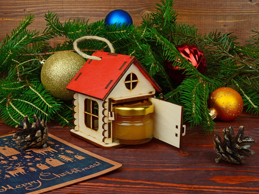 Подарочная упаковка Домик выполнена в виде игрушки, которую легко можно поставить на стол, шкаф или повесить на стену. Ее также можно использовать, как елочное украшение или новогодний подарок. Она изготовлена из экологически чистых материалов и обладает чарующим древесным ароматом. В домике открывается дверца, и в него можно поместить небольшую баночку с медом или вареньем. Яркие цвета крыши домиков и эффектная конструкция помогут украсить любой интерьер, как в офисе, так и в квартире. Подарочная упаковка Домик” позволит вам сделать оригинальный и запоминающийся подарок для руководителя или коллеги.