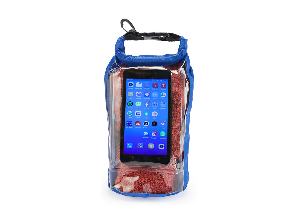Водонепроницаемая сумка из прочного рипстопа. Практичное окошко с карманом для мобильного телефона. Водонепроницаемая система закрытия с защелкой и карабином для транспортировки. Общий объем: 3 л. Полезный объем: 2,5 л.