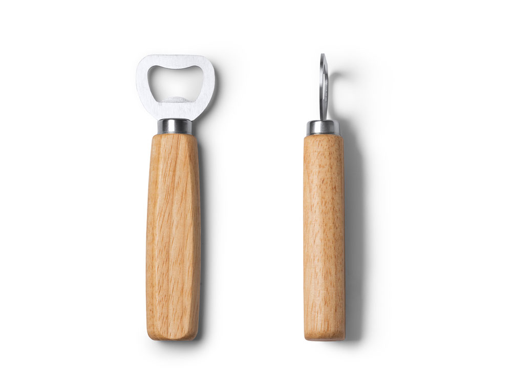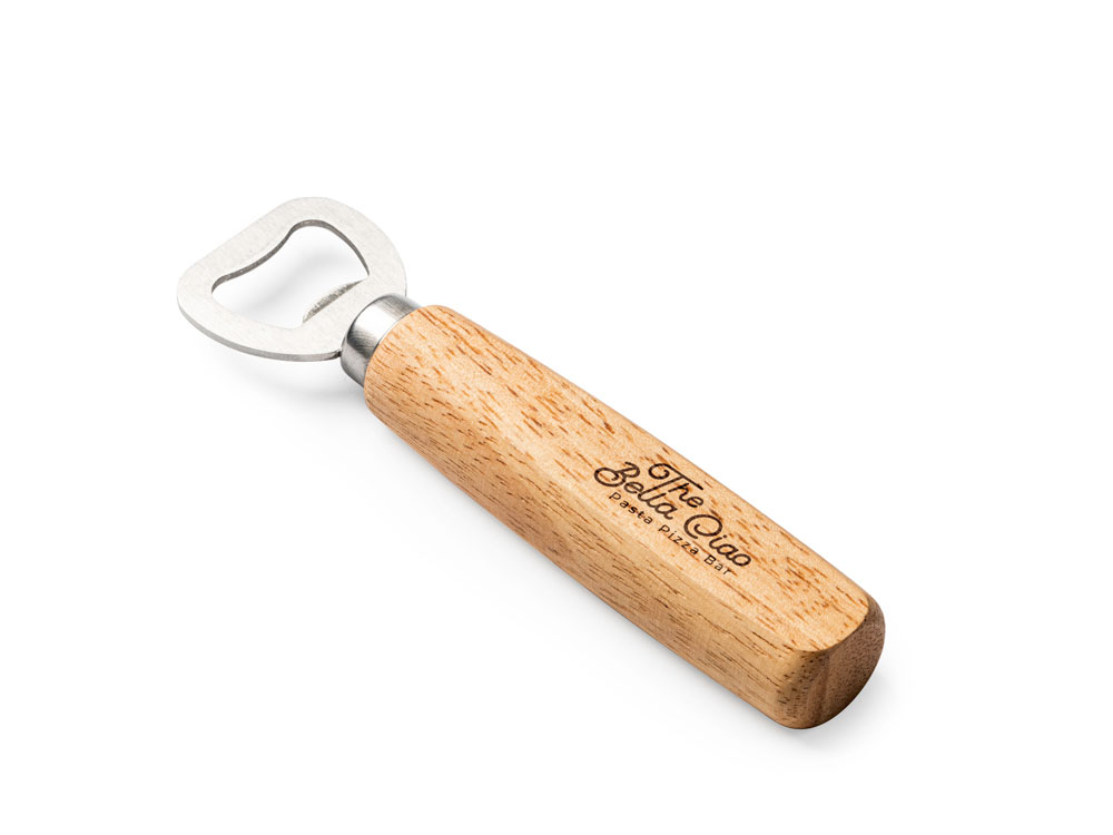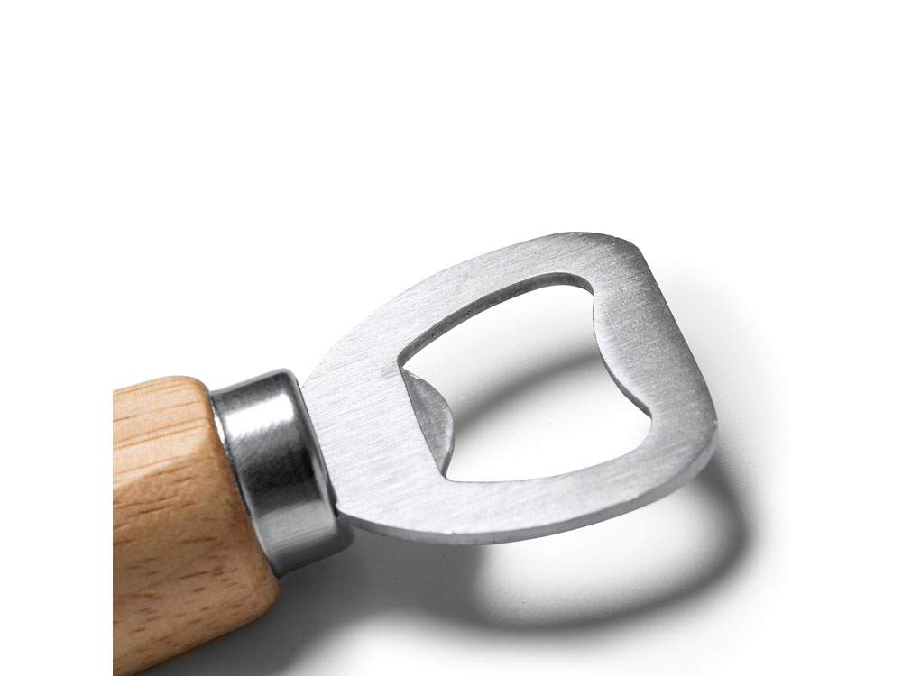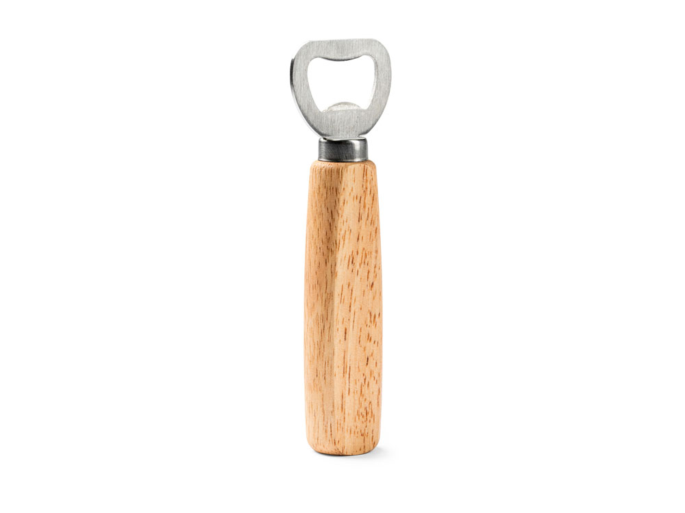 Открывалка из нержавеющей стали с ручкой из натурального дерева.