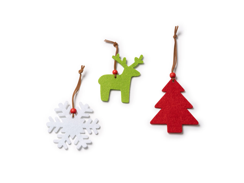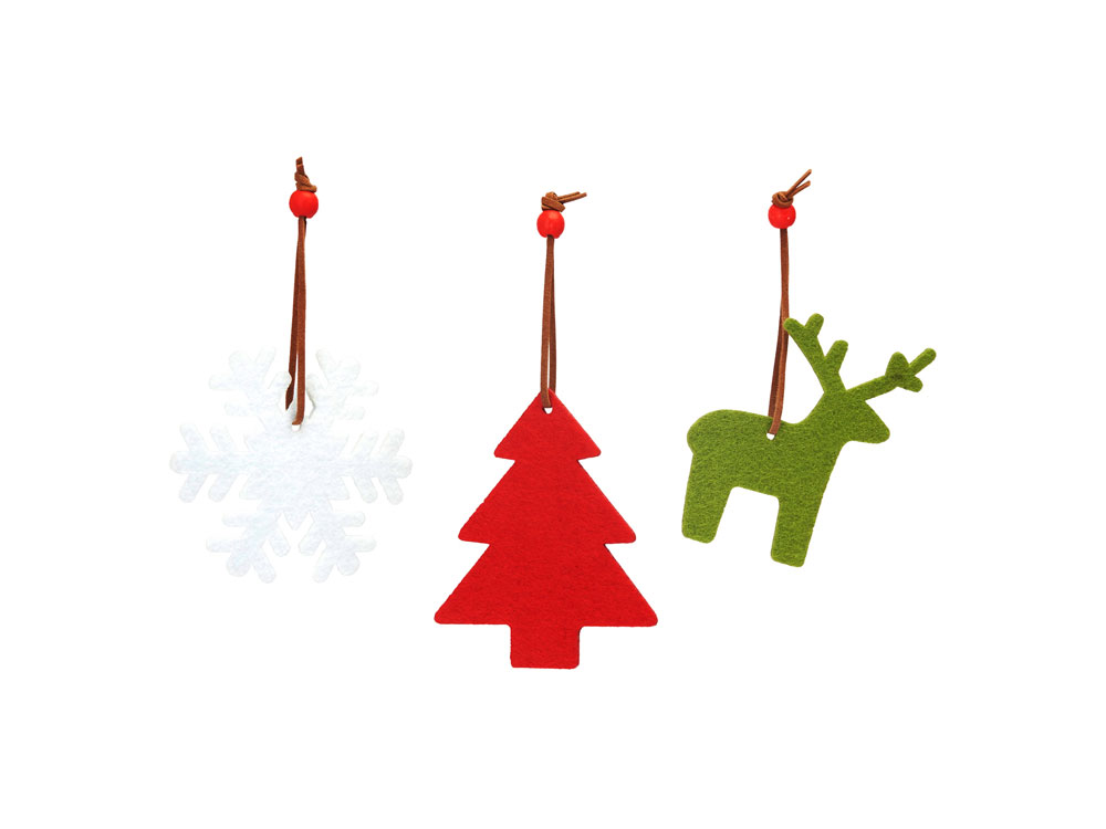 Новогоднее украшение из фетра доступно в трех вариантах: снежинка, елка и олень. Все дизайны представлены с коричневым ремешком с красной бусиной.