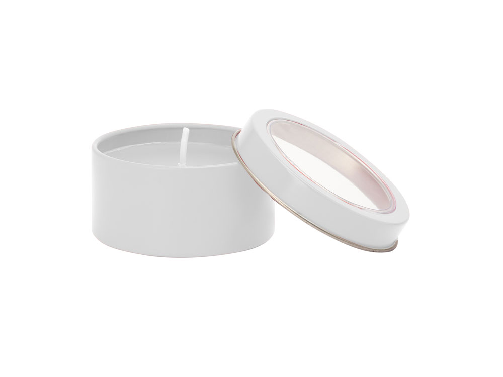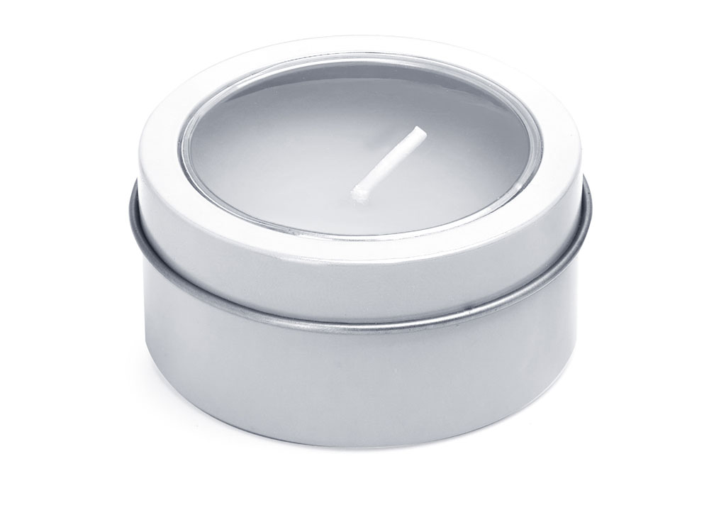 Ароматическая свеча с запахом ванили в металлическом круглом подсвечнике с крышкой с прозрачным окошком. Цвет свечи в тон подсвечника. белый фитиль