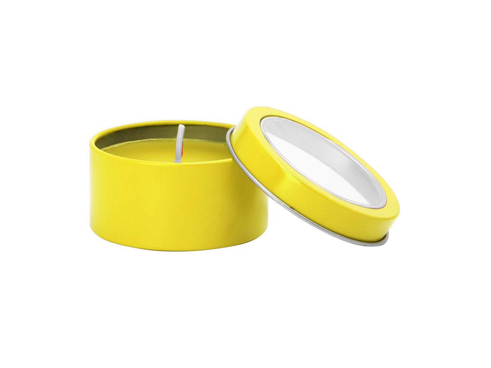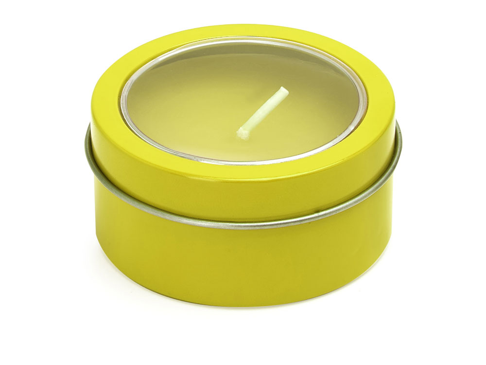 Ароматическая свеча с запахом ванили в металлическом круглом подсвечнике с крышкой с прозрачным окошком. Цвет свечи в тон подсвечника. белый фитиль