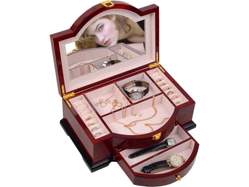 Удобная, практичная и вместительная шкатулка для хранения часов, украшений и драгоценностей выполнена из красного дерева. Основное отделение шкатулки разделено на места хранения колец, цепочек и часов. Также предусмотрен небольшой ящик.