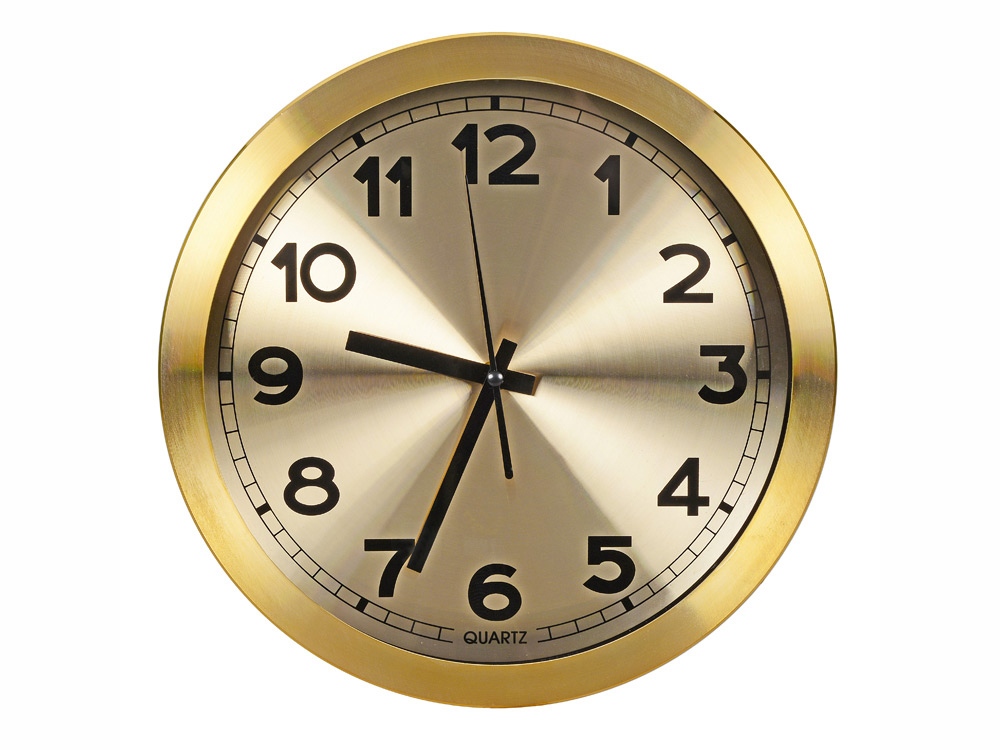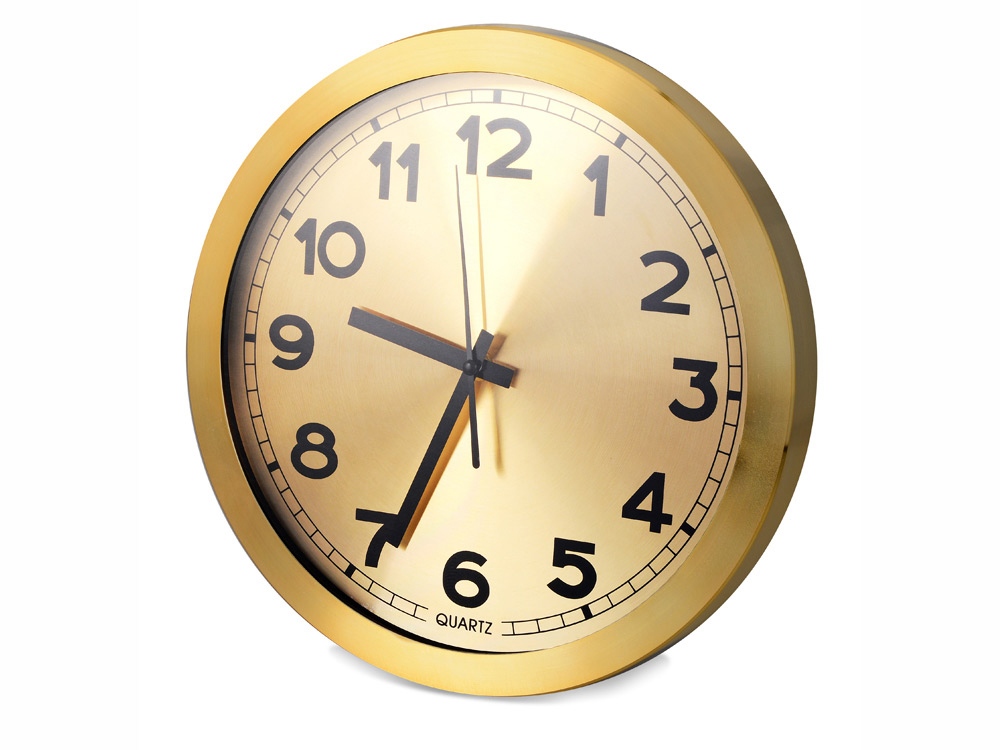 Настенные часы из золотистого металла украсят собой строгую приемную. Классический дизайн, диаметр циферблата – 30 см.