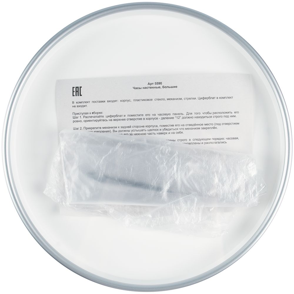Циферблат в комплект не входит, но его можно изготовить в индивидуальном дизайне методом полноцветной печати. Подготовьте макет согласно конструктору, напечатайте его на плотном картоне, вырежьте по контуру и аккуратно поместите в часы. Чтобы разобрать часы, аккуратно отодвиньте пластиковые защелки на корпусе по одной и приподнимите заднюю крышку. Для упора можно использовать ребра-полоски на задней крышке. Затем аккуратно снимите стрелки и открутите центральную гайку механизма.