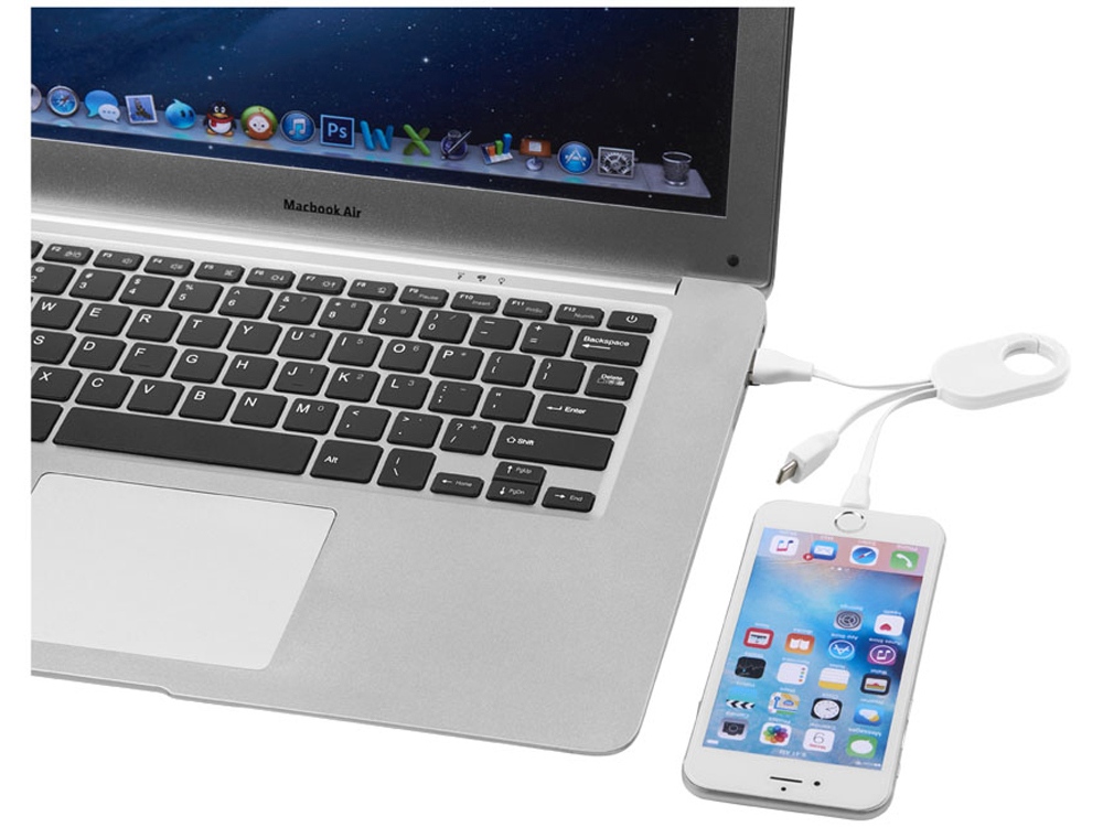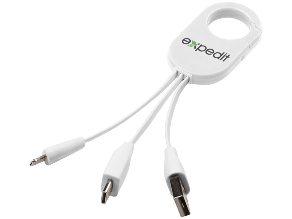 Кабель для зарядки 3-в-1. Кабель для зарядки Troop 3-в-1 с коннектором USB Type C и двойным совместимым коннектором 2-в-1 для устройств Apple® iOS и Android. Кабель оснащен карабином для удобного крепления к сумке. АБС-пластик.