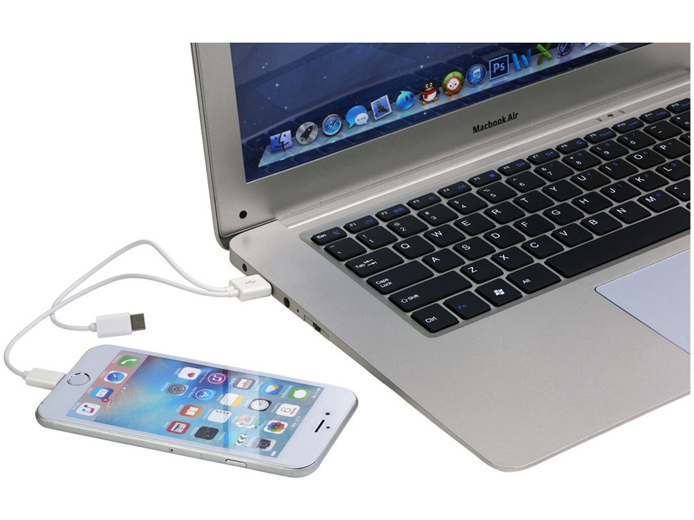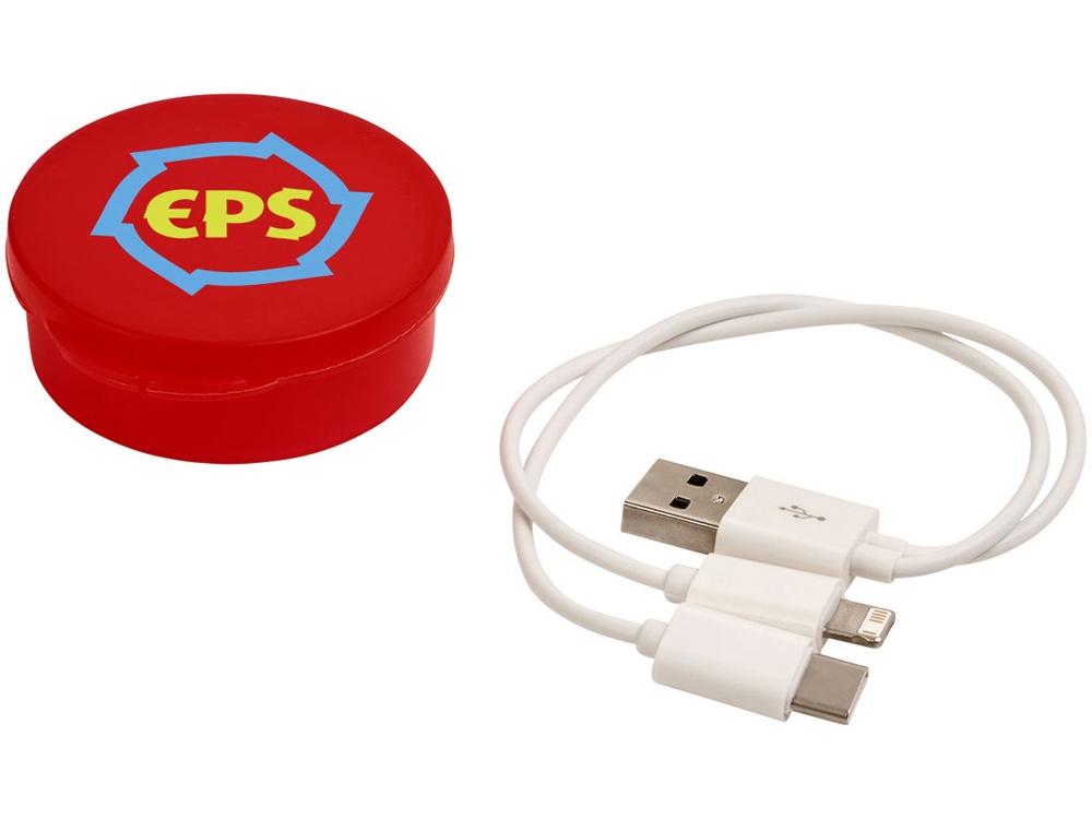Кабель для зарядки Versa 3-в-1 в футляре. Кабель для зарядки Versa 3-в-1 в круглом футляре с кабелем USB с несколькими коннекторами, включая USB Type C и двойной совместимый коннектор 2-в-1 для устройств Apple® iOS и Android. АБС-пластик.
