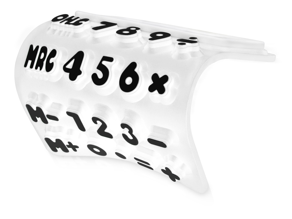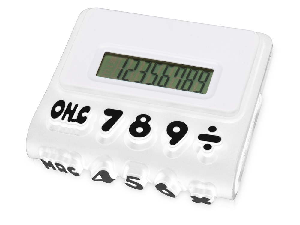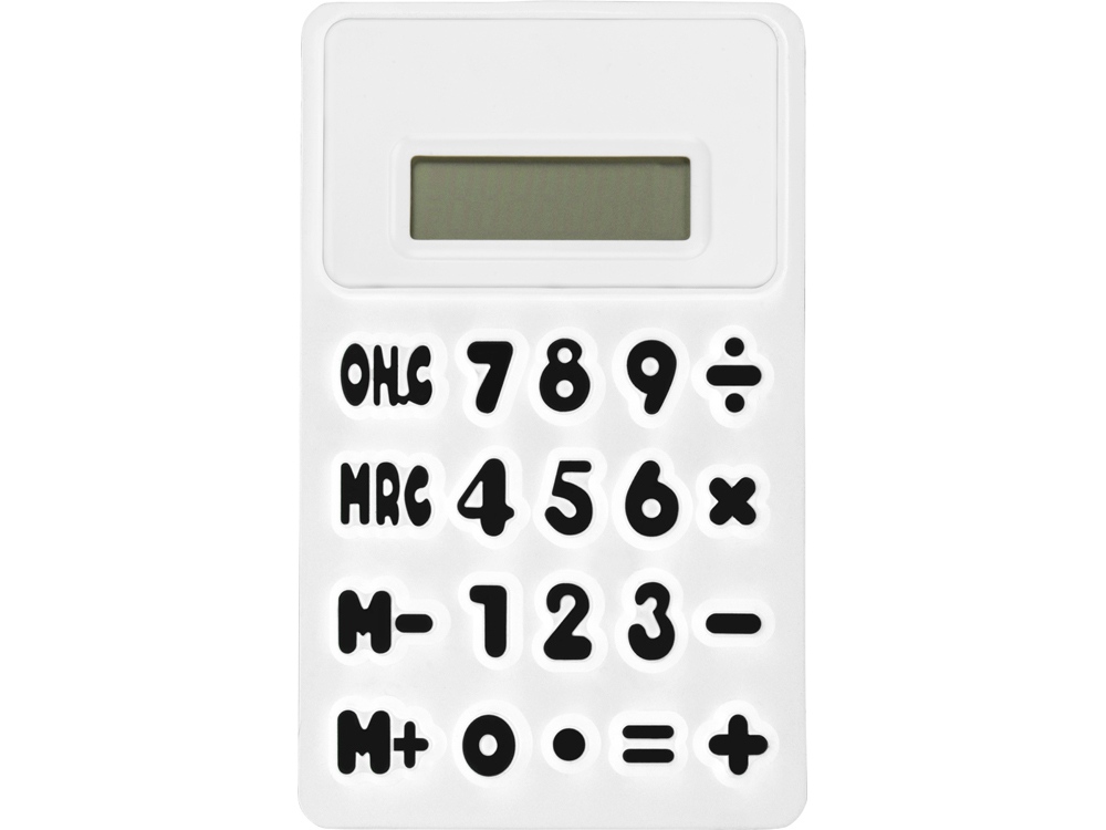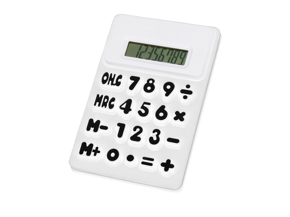 Гибкий калькулятор Splitz. Гибкий 8-разрядный калькулятор с белой отделкой, рельефными клавишами и функцией памяти. Батарейка включена в комплект. Силикон.