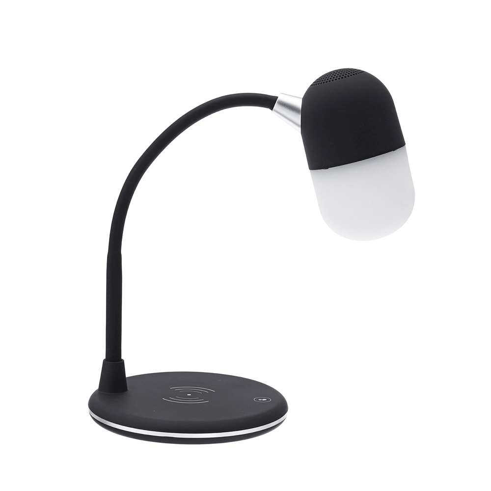 Настольная лампа с колонкой и беспроводной зарядкой Alladin. Тип светодиодного индикатора: cветодиодная панель (яркость 28LM±2), три режима настройки света (яркий, теплый, холодный), 7 светодиодов. Мощность: 5 Вт. Максимальная мощность беспроводного зарядного устройства: 5/10 Вт (опционально). Мощность динамика: 3 Вт. Вход:5V/3A. Версия Bluetooth: V5.0. В комплекте кабель USB и инструкция.