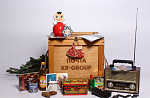 Неваляшка, отрывной календарь, лимонад «Буратино», баночка сгущенки, коробка конфет «Птичье молоко», эмалированная кружка, игры лото и домино, тройной одеколон, набор ёлочных игрушек, радио-приёмник, ретро-открытки и газета.