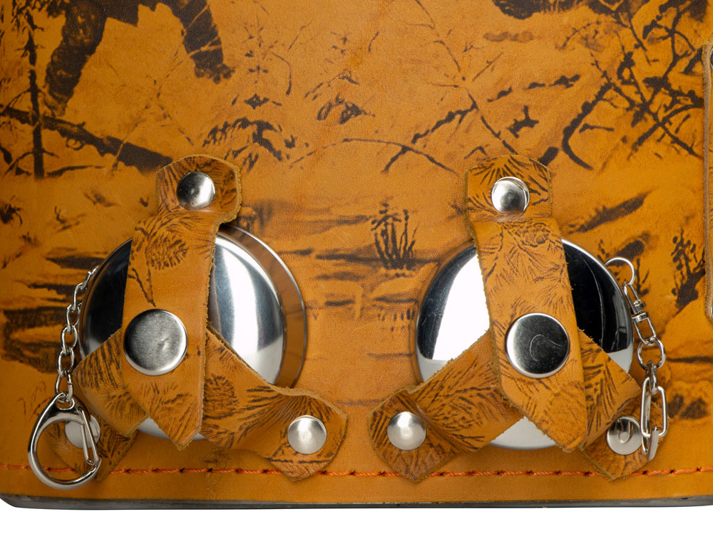Фляга 1,5л в оплетке из натуральной кожи с нанесением рисунка методом художественного выжигания.