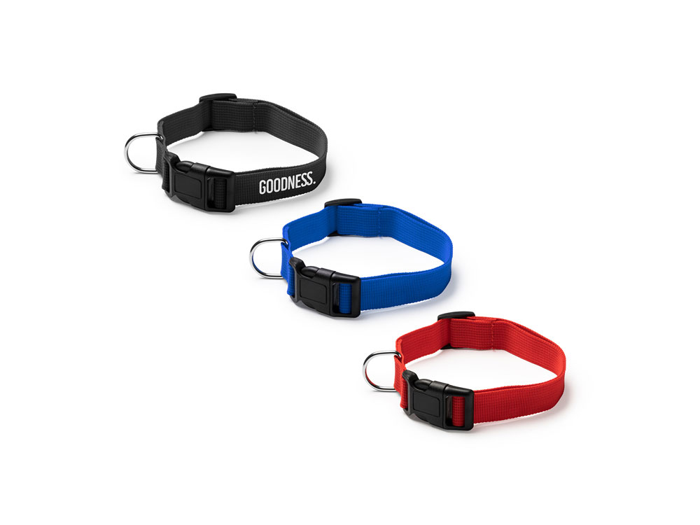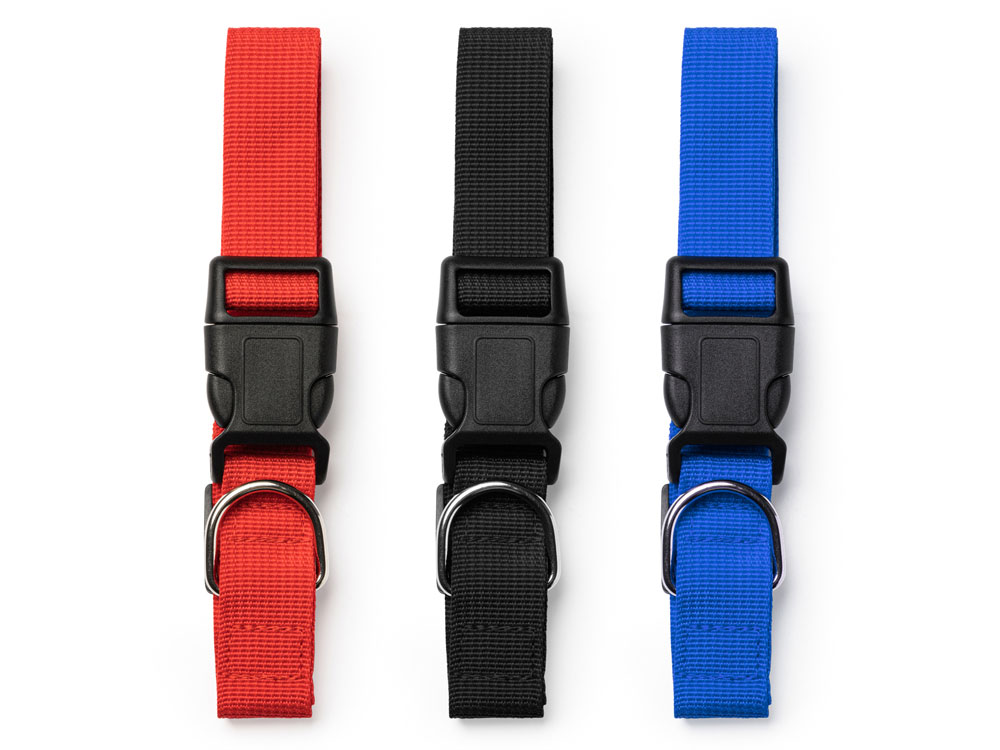 Ошейник для домашних животных из прочного и мягкого полиэстера. Регулируемый ремешок и пряжка с застежкой. Включает металлическое кольцо для прогулочного поводка.