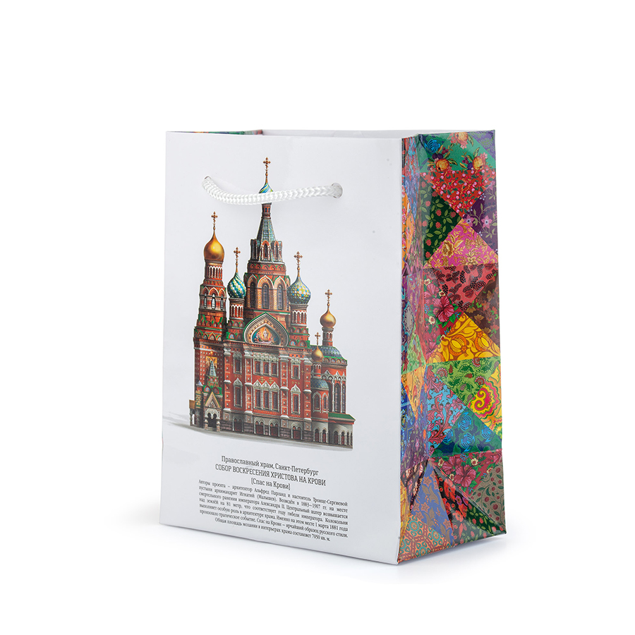 Пакет маленький Сугревъ с изображением собора "Спаса на Крови" Подарочный прочный ламинированный пакет с люверсами и плетёными верёвочными ручками из толстого шнура. Пакет снабжён авторской иллюстрацией и описанием истории собора Спаса на Крови на русском и английском языках и в этом смысле не имеет аналогов. Боковины пакета декорированы эффектным узором в стиле пэчворк, напоминающим лоскутное одеяло. Размер пакета позволяет положить в него одну или две маленькие упаковки чая. Это идеальное решение для ситуации, когда вам необходимо сделать много эффектных, но недорогих подарков. Размер: 14 х 11 х 6 смСрок поставки в рамках заказной программы составляет 7-9 рабочих днейПродукции «Сугревъ» много не бывает. Чтобы заказать её в необходимом количестве, обращайтесь к персональному менеджеру. Он сориентирует по стоимости и срокам поставки.