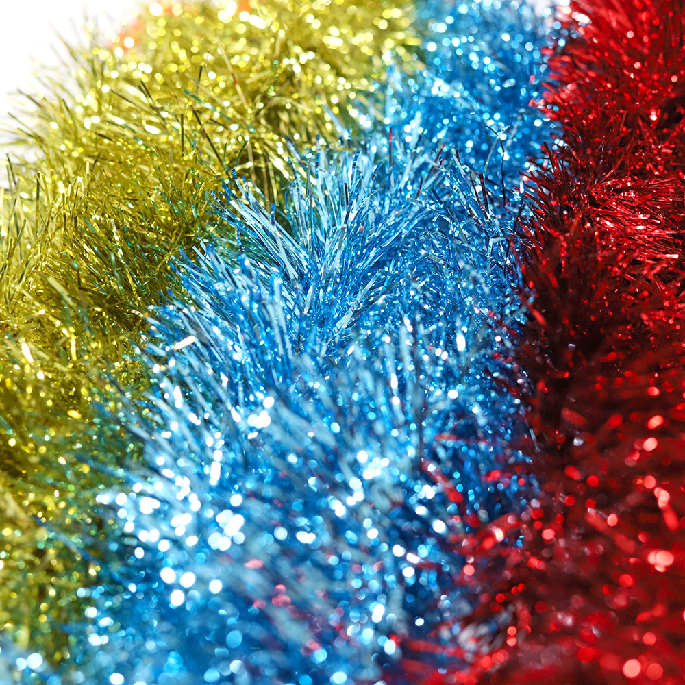 Праздничную атмосферу Нового года создаст новогодняя мишура своими яркими цветами (синий, красный, золотой) и неповторимым шуршащим звуком.