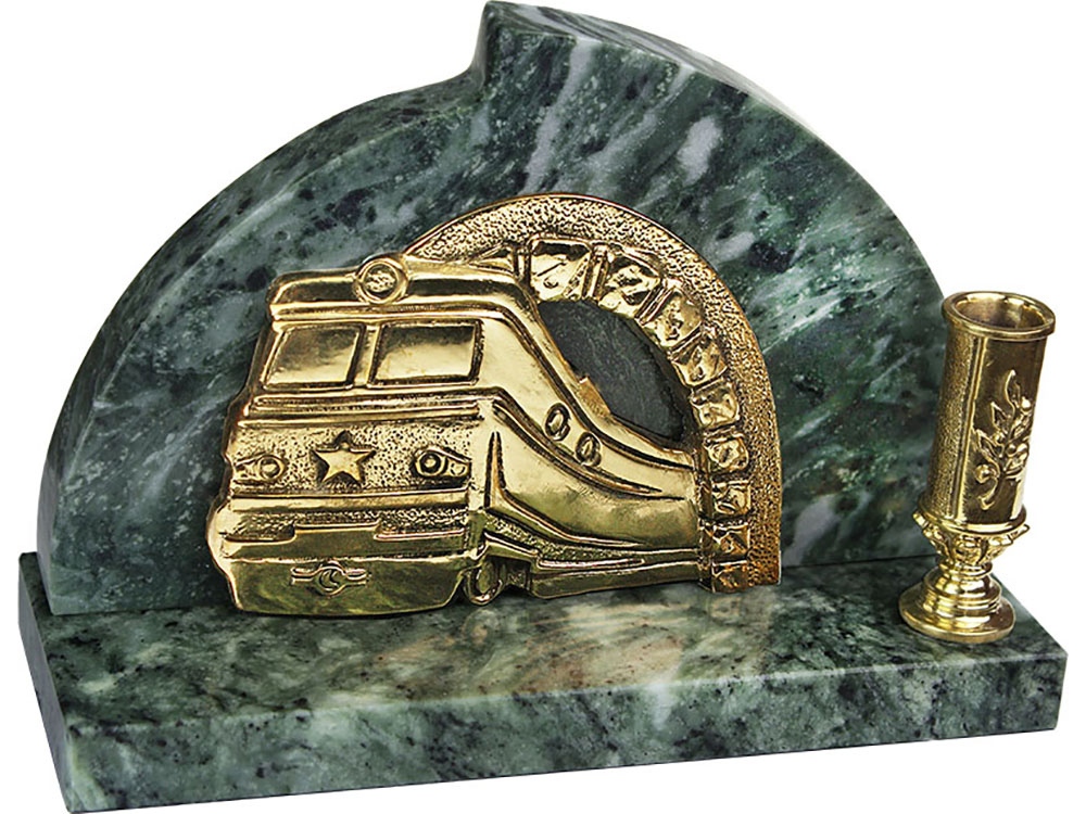 Оригинальная идея для подарка руководству транспортных, железнодорожных и туристических компаний. Прибор с подставкой из змеевика оснащен держателем для ручки и изображением поезда из латуни с бронзовым покрытием.