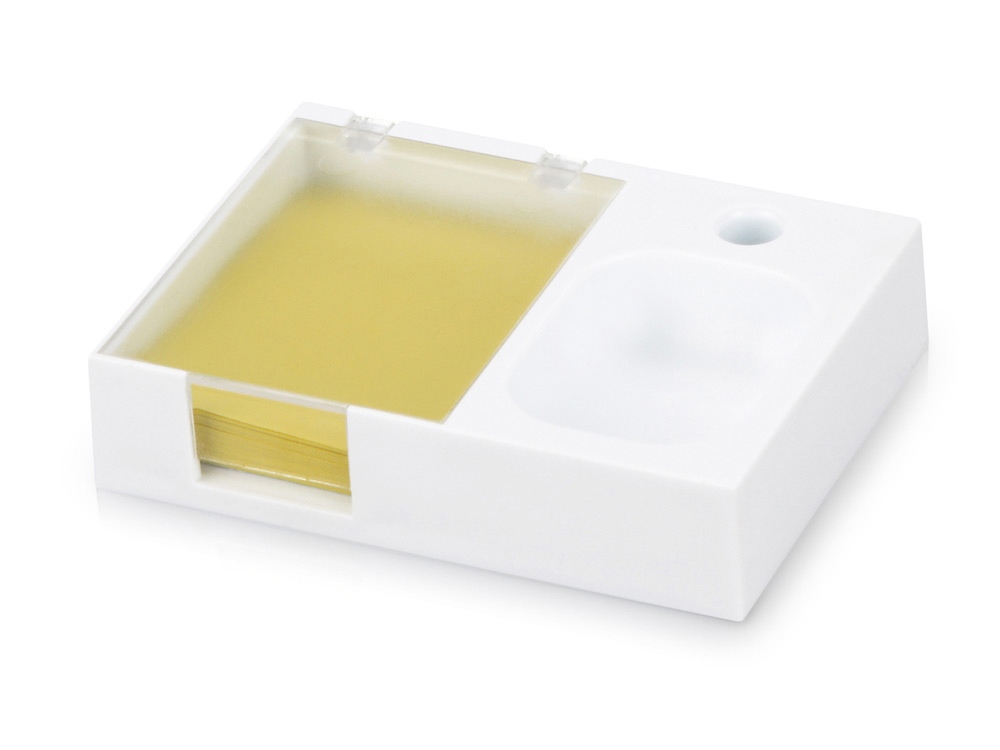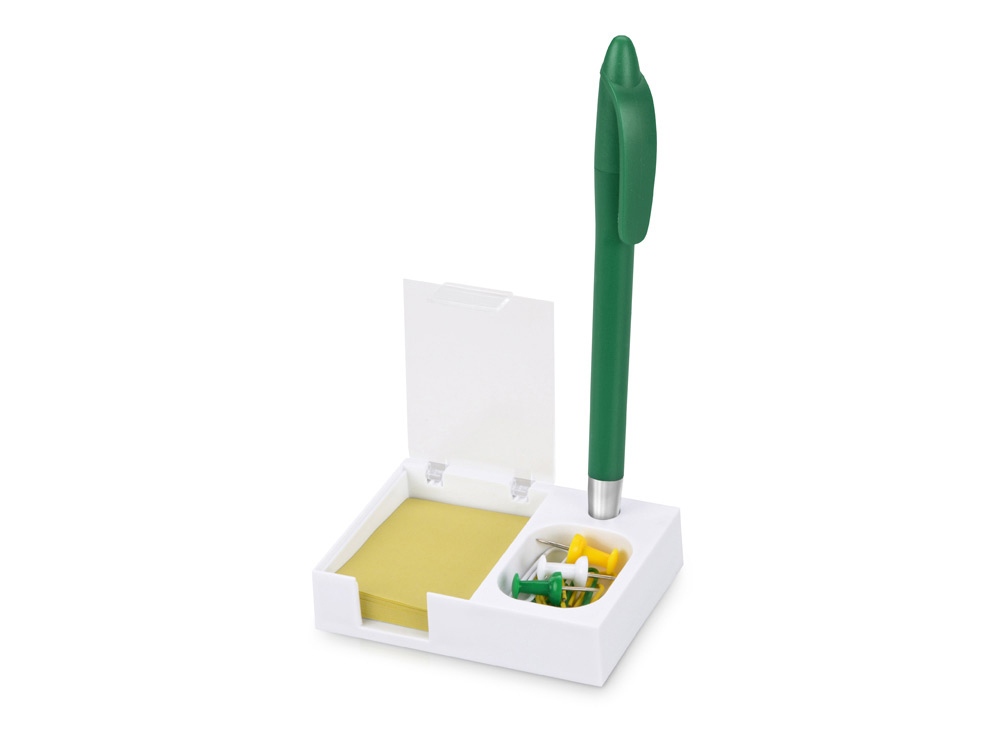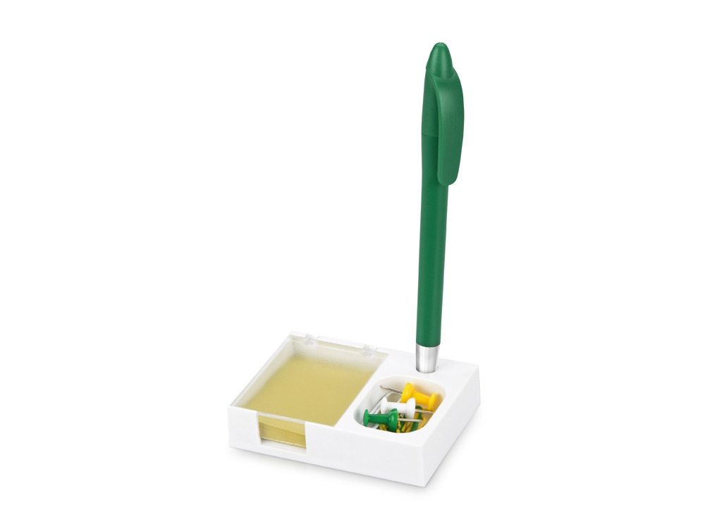 Яркая и удобная поставка под ручку, канцелярские скрепки и бумажный блок (4 х 5 см) превосходно организует ваше рабочее место. Отличный подарок при проведении промо-акций.